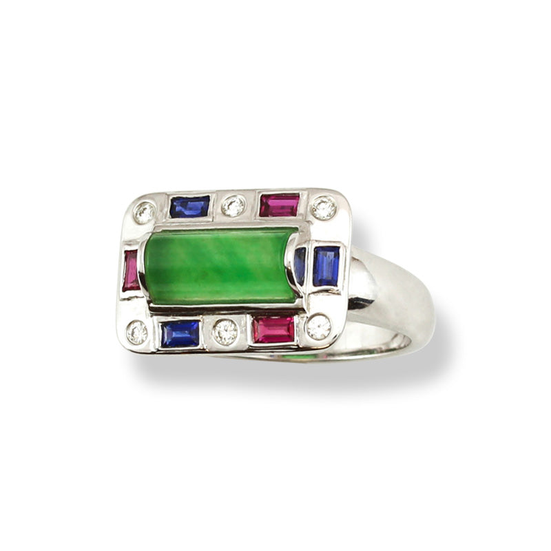 18K White Gold Green Jadeite Jade Ring with Ruby and Sapphire | UPC #318441