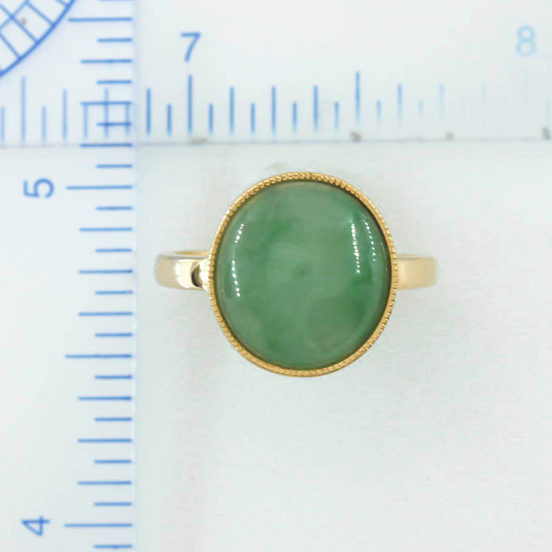 Gorgeous! One-of-a-kind green jadeite jade oval cabochon ring with a milgrain bezel mounting. Stunning color in a classic setting ring.