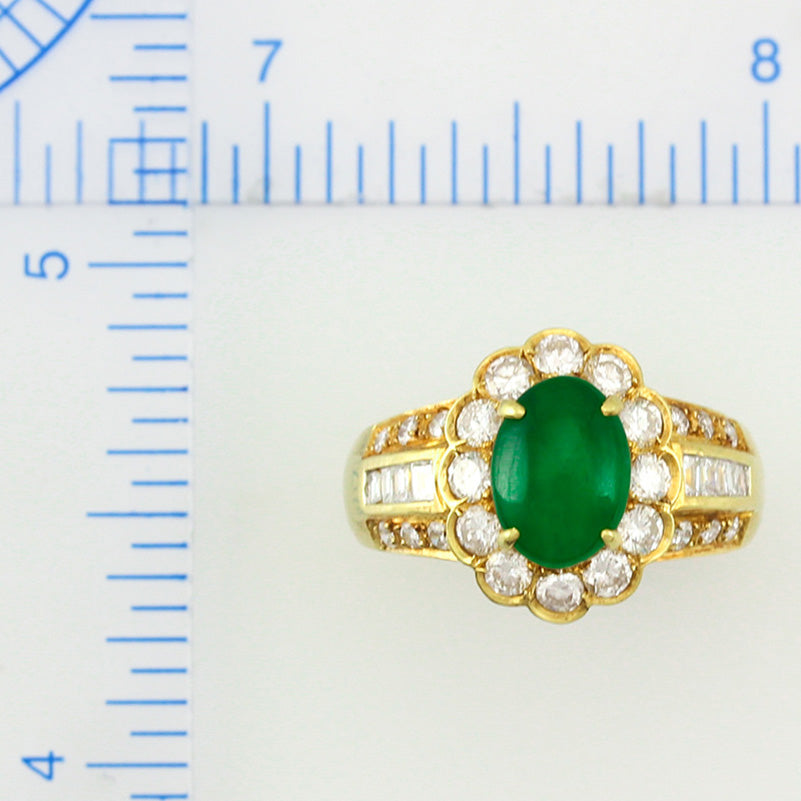 Vivid green oval jadeite jade center stone with good translucency accented by a halo of natural round diamonds. The 18K yellow gold mounting features baguette and round diamonds down the shank. This authentic jade ring for women is pre-loved and a part of our Estate Jade Collection. Shop natural jade rings from Mason-Kay Jade for your jade jewelry collection.