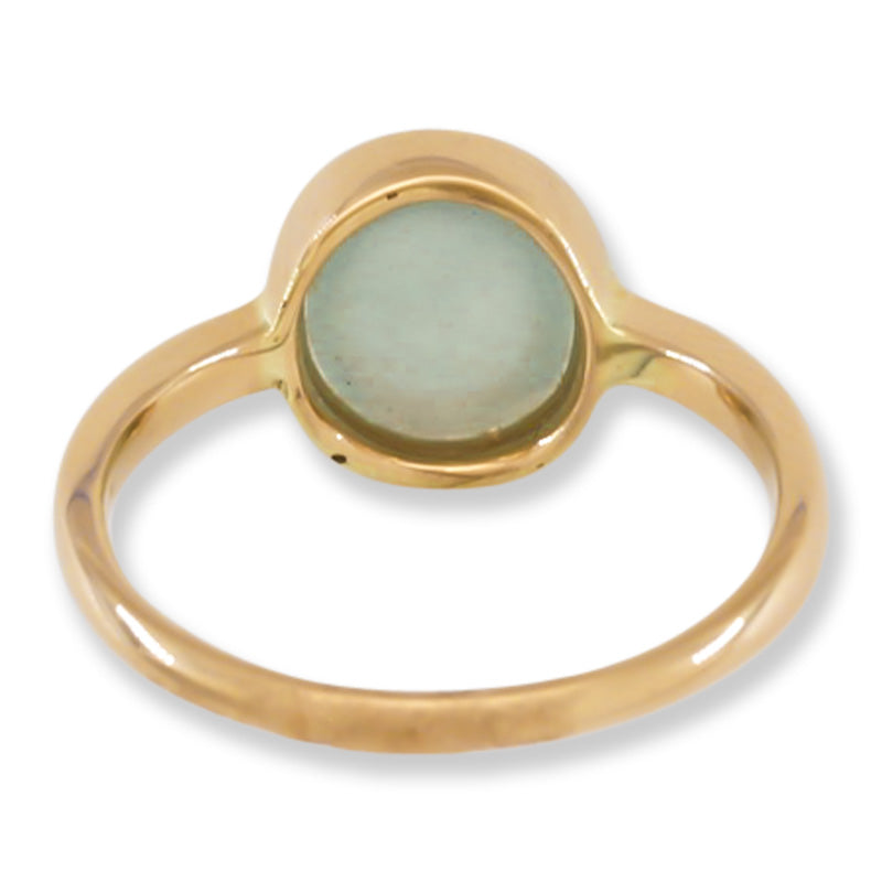 Celebrate timeless beauty with this solitaire ring showcasing a stunning round cabochon of watery green jadeite jade in a fabulous millgrain bezel. Blending classic craftsmanship with elegant style, this ring adds a unique and lasting charm to your collection.