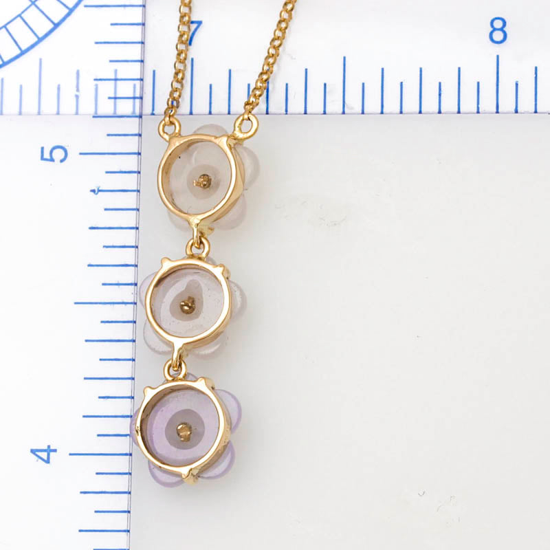 Lavender jadeite jade carved necklace featuring three ombre carved lavender flowers with a diamond center on a 14K yellow gold adjustable 20" and 18” chain.