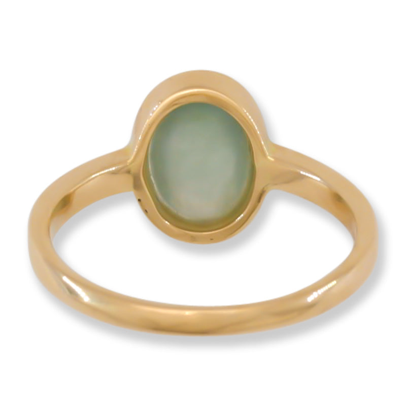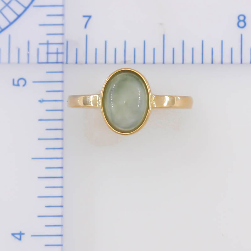 Experience timeless beauty with this exquisite solitaire ring showcasing a stunning oval cabochon of water jadeite jade. A flawless combination of classic style and elegant charm for lasting sophistication.