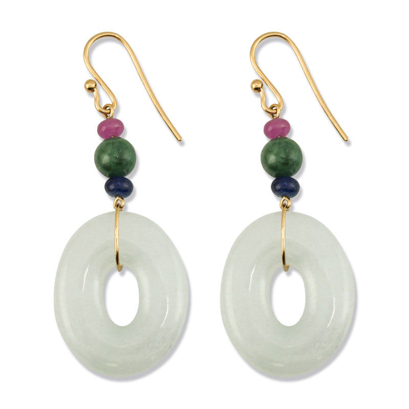 14K Yellow Gold green and Lavender Jadeite Jade Carved Bead Earrings | UPC #388925