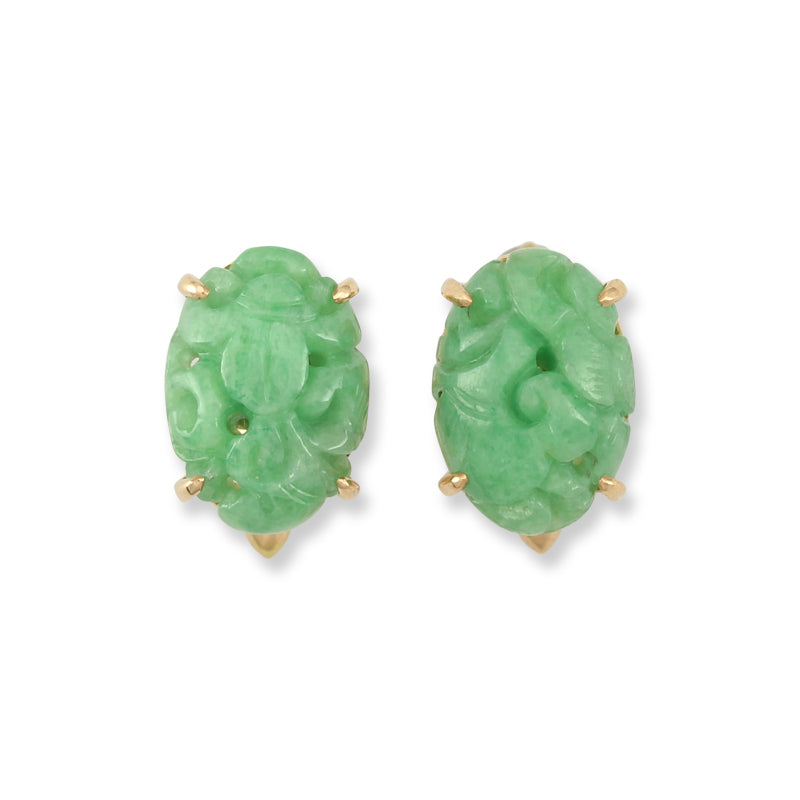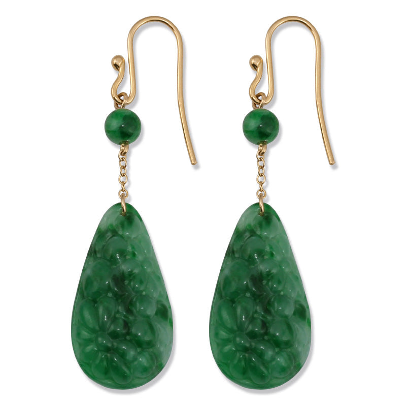 18K YELLOW GOLD GREEN JADEITE JADE CARVED TEAR DROP EARRING UPC #376526